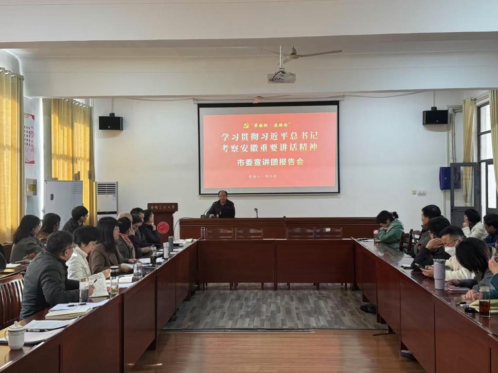 为深入学习宣传贯彻习近平总书记考察安徽重要讲话精神,11月28日,yl7703永利在学院325报告厅举办学习贯彻习近平总书记考察安徽重要讲话精神宣讲报告会,市委讲师团倪松根老师应邀作宣讲报告。会议由学院党委书记徐惠主持,学院全体教职工出席了会议。