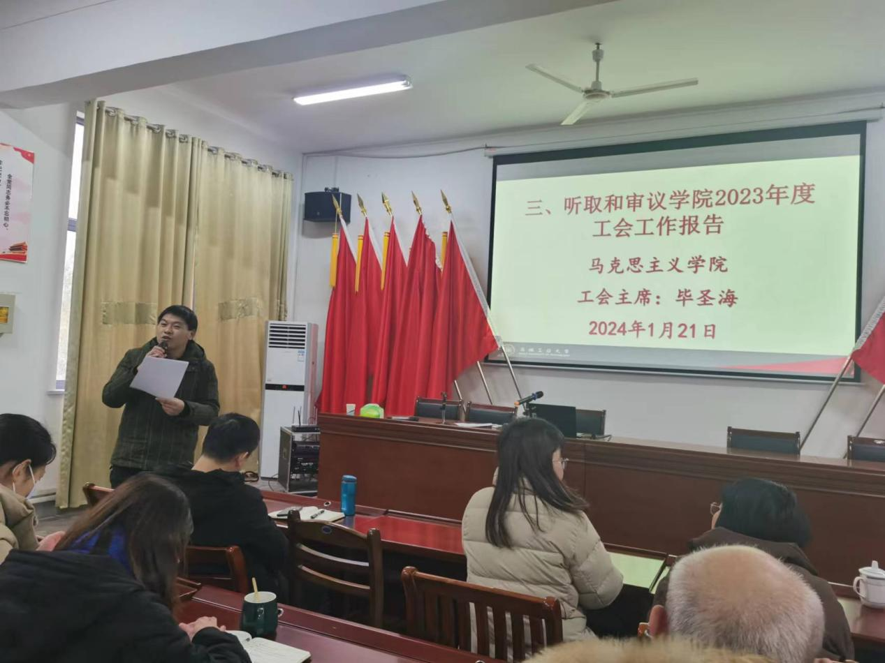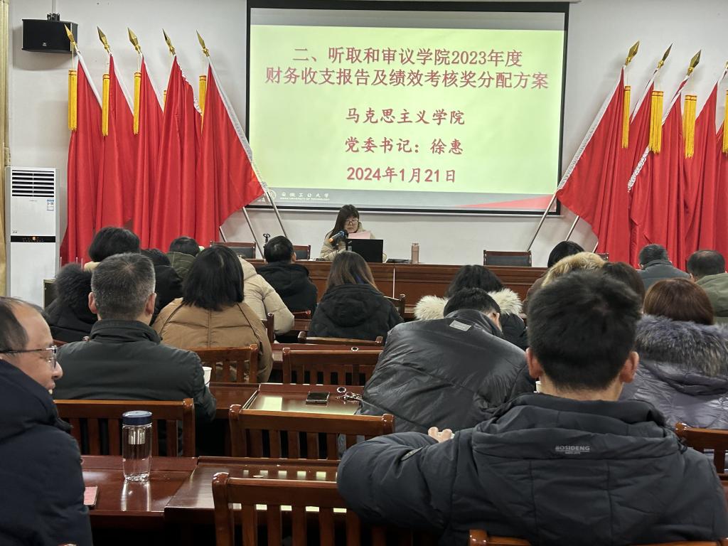大会听取了学院党委书记徐惠所作的工作报告。报告从党建及师德师风建设、思政课教学、科研工作及平台建设、教师队伍建设、学科建设和研究生工作等方面对学院2023年工作进行了全面总结。深刻分析了当前学院发展面临的新形势和新任务,指出了学院发展存在的问题与不足,并就切实抓好2024年相关工作作了全面展望与部署。