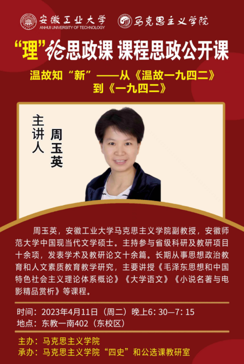 主讲人物介绍:周玉英,yl7703永利副教授,安徽师范大学中国现当代文学硕士。主持参与省级科研及教研项目十余项,发表学术及教研论文十余篇。长期从事思想政治教育和人文素质教育教学研究,主要讲授《毛泽东思想和中国特色社会主义理论体系概论》《大学语文》《小说名著与电影精品赏析》等课程。