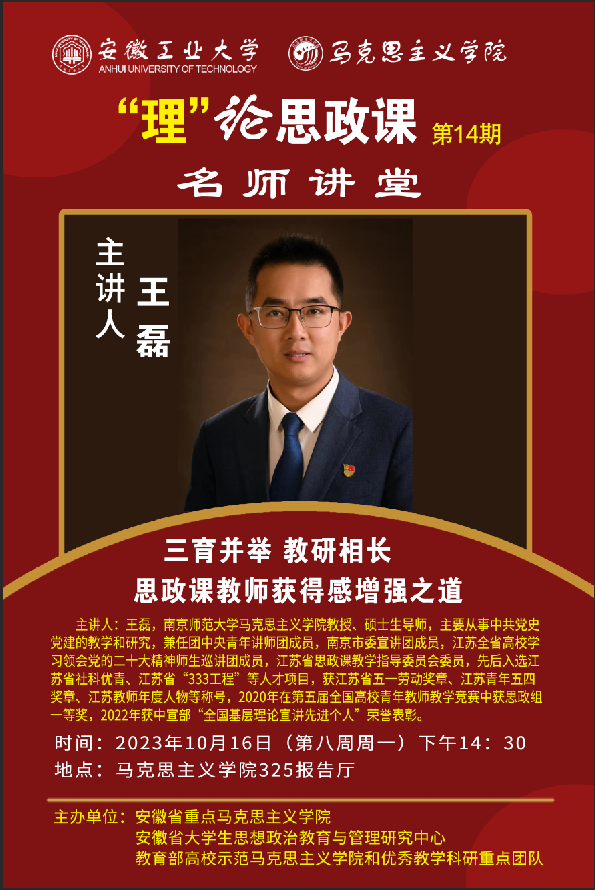 2023年10月16日(周一)下午14:30在学院325报告厅举办第十四期“‘理’论思政课”名师讲堂活动,本次活动邀请南京师范大学yl7703永利教授、硕士生导师王磊主讲“三育并举 教研相长 思政课教师获得感增强之道”。欢迎学院全体教师、研究生积极参加。